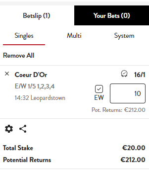 • €10 Each-Way = €20 total stake